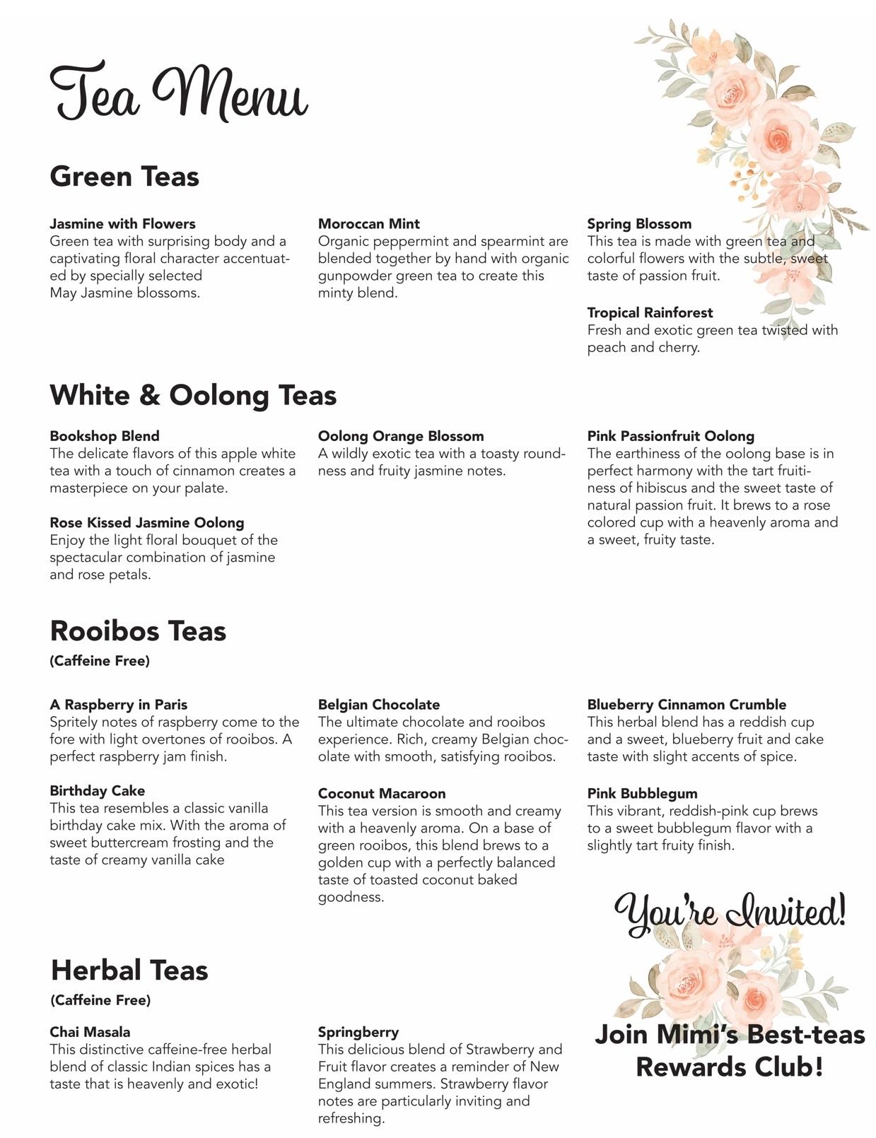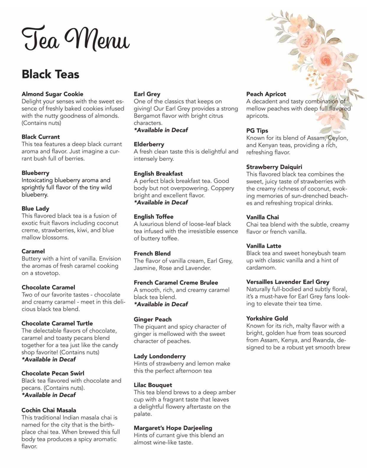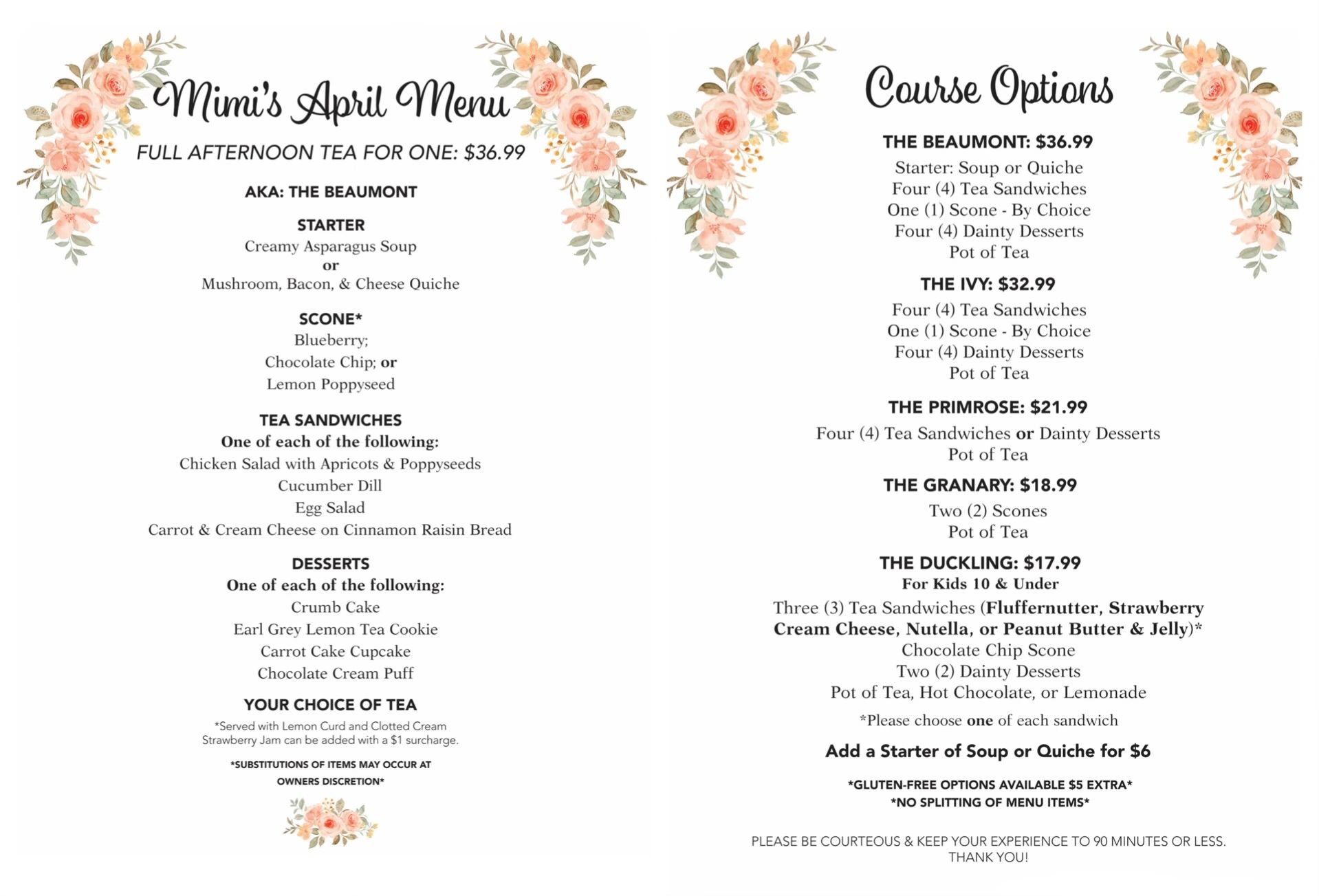 4 Tea Sandwiches- 1 Scone By Choice - 4 Dainty Desserts- Pot of Tea